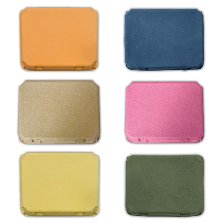 Stack of colorful vintage egg cartons in brown, pink, yellow, green, and blue.